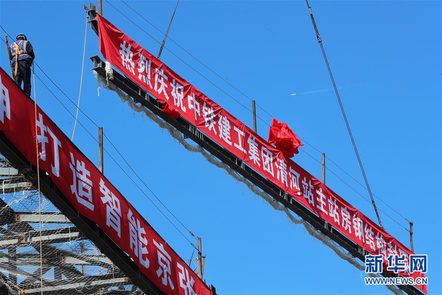 10月17日,工作人員在吊裝鋼梁。當(dāng)日,京張高鐵新建車站——清河站主體結(jié)構(gòu)正式封頂。清河站是京張高鐵建筑面積最大的車站,同時也是京張高鐵在北京地區(qū)的始發(fā)站之一。 新華社記者 邢廣利 攝