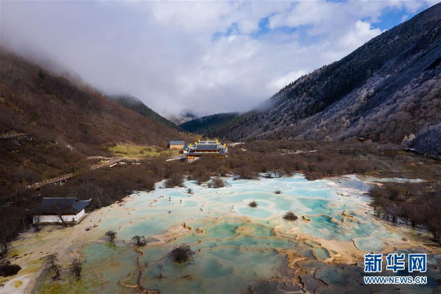 俯瞰黃龍溝五彩池和黃龍寺(10月19日無人機拍攝)。深秋時節(jié),在雪山、藍天、白云和彩林映襯下,黃龍溝中的彩池色彩更加斑斕,目前黃龍景區(qū)進入觀賞最佳時節(jié)。黃龍風景名勝區(qū)位于四川省松潘縣境內(nèi),以彩池、灘流、雪山、峽谷、森林等聞名,享有“人間瑤池”“圣地仙境”之美譽。新華社記者 江宏景攝