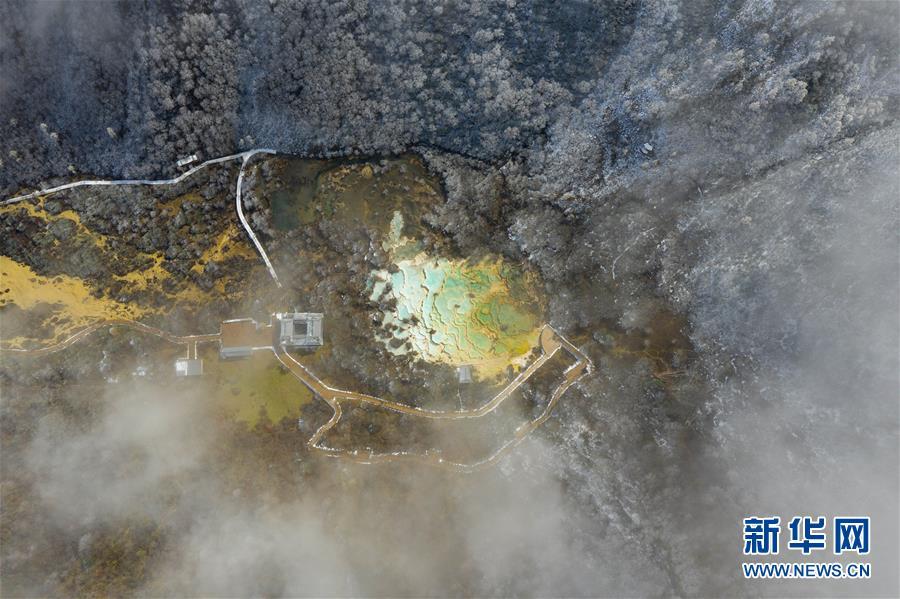 俯瞰黃龍溝爭艷池一角(10月19日無人機拍攝)。深秋時節(jié),在雪山、藍天、白云和彩林映襯下,黃龍溝中的彩池色彩更加斑斕,目前黃龍景區(qū)進入觀賞最佳時節(jié)。黃龍風景名勝區(qū)位于四川省松潘縣境內(nèi),以彩池、灘流、雪山、峽谷、森林等聞名,享有“人間瑤池”“圣地仙境”之美譽。新華社記者 江宏景攝