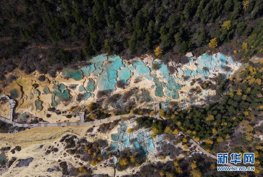俯瞰黃龍溝五彩池一角,彩池錯落有致,宛如層層玉盤(10月19日無人機拍攝)。 深秋時節(jié),在雪山、藍天、白云和彩林映襯下,黃龍溝中的彩池色彩更加斑斕,目前黃龍景區(qū)進入觀賞最佳時節(jié)。黃龍風景名勝區(qū)位于四川省松潘縣境內(nèi),以彩池、灘流、雪山、峽谷、森林等聞名,享有“人間瑤池”“圣地仙境”之美譽。新華社記者 江宏景攝
