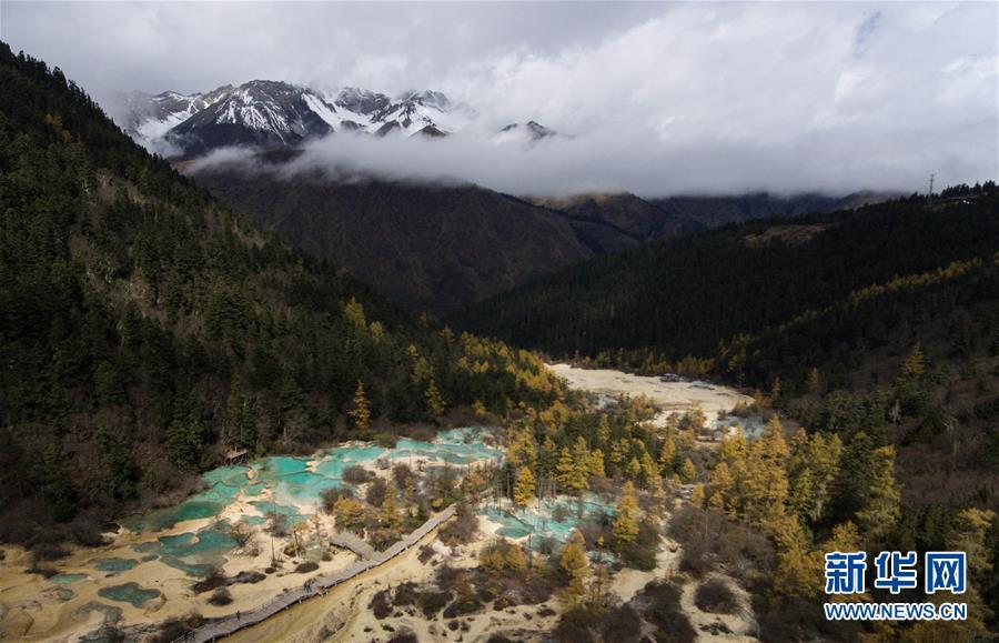雪山、彩林、彩池構成一幅色彩斑斕的畫卷(10月19日無人機拍攝)。深秋時節(jié),在雪山、藍天、白云和彩林映襯下,黃龍溝中的彩池色彩更加斑斕,目前黃龍景區(qū)進入觀賞最佳時節(jié)。黃龍風景名勝區(qū)位于四川省松潘縣境內(nèi),以彩池、灘流、雪山、峽谷、森林等聞名,享有“人間瑤池”“圣地仙境”之美譽。新華社記者 江宏景攝