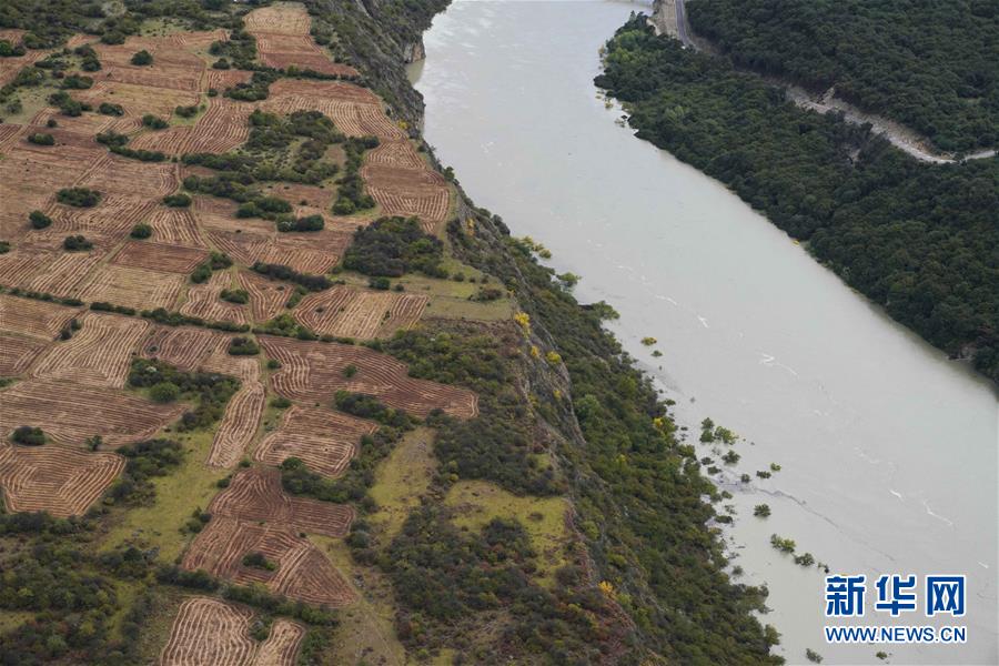 空中俯瞰通往加拉村已淹沒的公路(10月18日攝)。 新華社記者 普布扎西攝