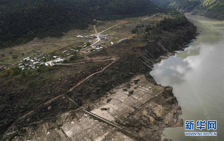 10月20日,西藏雅魯藏布江米林縣堰塞湖自然過流,露出通往加拉村的道路。 10月19日13時30分,西藏雅魯藏布江米林縣堰塞湖開始自然過流。記者從應急管理部牽頭的聯(lián)合工作組獲悉,截至20日7時,雅魯藏布江堰塞湖壩前水位已下降56米,估算留存水量1.6億立方米,堰塞湖洪水威脅得到緩解,防洪安全風險大大減輕,并將繼續(xù)降低。 10月20日,記者乘坐直升機從空中拍攝了雅魯藏布江堰塞湖自然過流的畫面。 新華社記者普布扎西攝