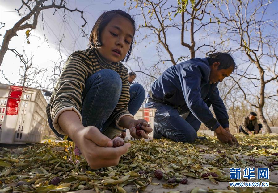 10月20日,在且末縣阿熱勒鎮(zhèn)有機紅棗園里,一名小朋友在幫家人撿紅棗。