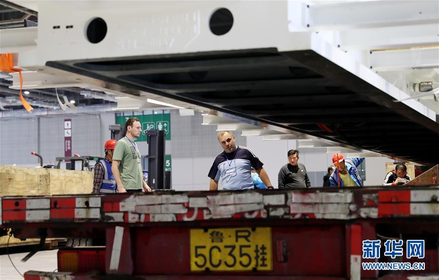 10月22日,德國工程師馬丁·霍爾茨海德(中)在吊裝過程中查看“金牛座”龍門銑床床身位置。 當(dāng)日,來自德國的首屆進口博覽會最大展品——“金牛座”龍門銑床完成初步組裝,將運往國家會展中心(上海)3號館進行最后的安裝施工。這是德國瓦德里??票す狙邪l(fā)的機床設(shè)備,高約8米,占地面積約200平方米,將在智能及高端裝備區(qū)進行展出。 新華社記者方喆攝