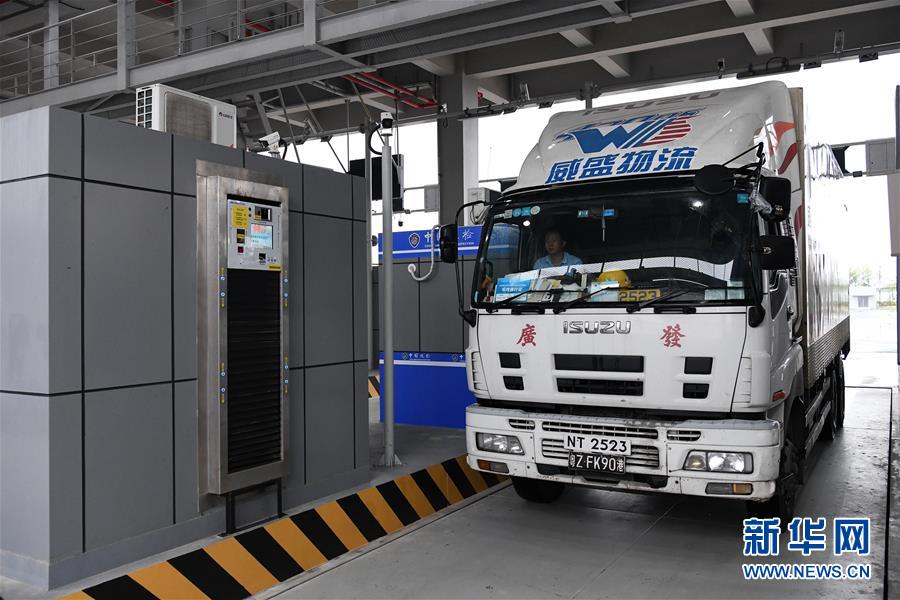 這是貨運(yùn)車輛在進(jìn)行模擬通關(guān)(10月17日攝)。  新華社記者 梁旭 攝