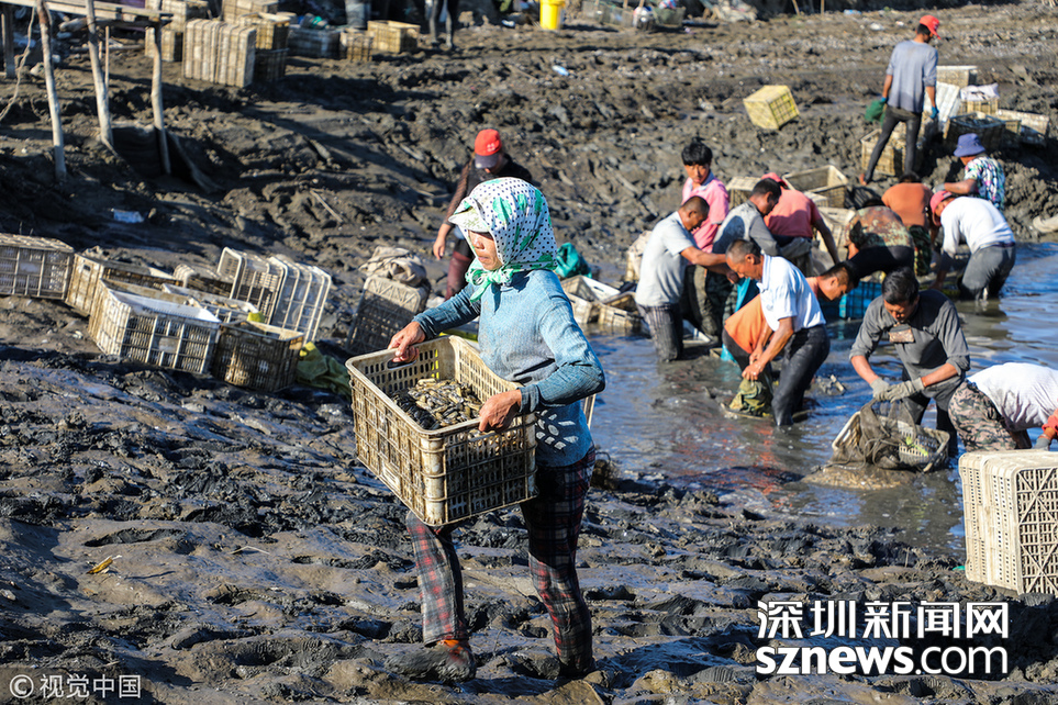 深圳新聞網訊 2018年9月8日,遼寧丹東,早上5點,挖蟶人紛紛下到各個池子,要在海水海泥里艱辛勞作10小時,直至下午3點集體上岸,等待買家的運輸車隊運走他們的勞動成果。9月初,遼寧沿海養(yǎng)殖區(qū)進入養(yǎng)殖海鮮的收獲季。在東港,常常出現(xiàn)數(shù)百人乃至上千人集結在池子里挖蟶子(這里特指縊蟶,即東港當?shù)厝怂f的小人仙。下同)的壯觀景象。在養(yǎng)殖海鮮的收獲季,成群的海鷗趁機“助陣“,人與大自然和諧共處的畫面令人嘆為觀止。