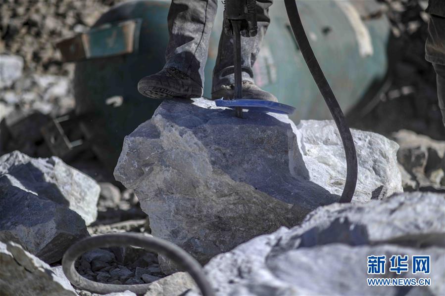 在興發(fā)達玉礦,一位采玉師傅在一塊玉石上打眼,便于觀察玉石品質(zhì)(10月23日攝)。 新華社記者趙戈攝