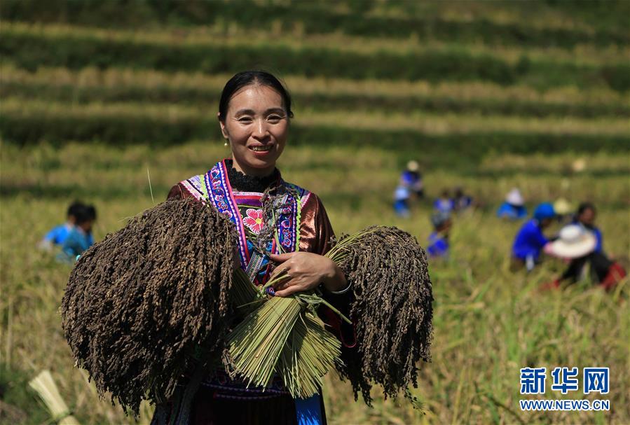 10月30日,在廣西融水苗族自治縣安太鄉(xiāng)元寶村,合作社負(fù)責(zé)人謝秀萍在展示剛剛收獲的香糯。 新華社記者 吳建路 攝