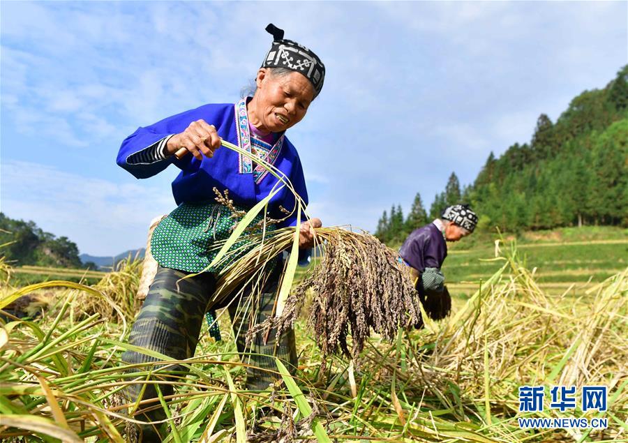 10月30日,在廣西融水苗族自治縣安太鄉(xiāng)元寶村,村民在收獲香糯。 新華社記者 吳建路 攝