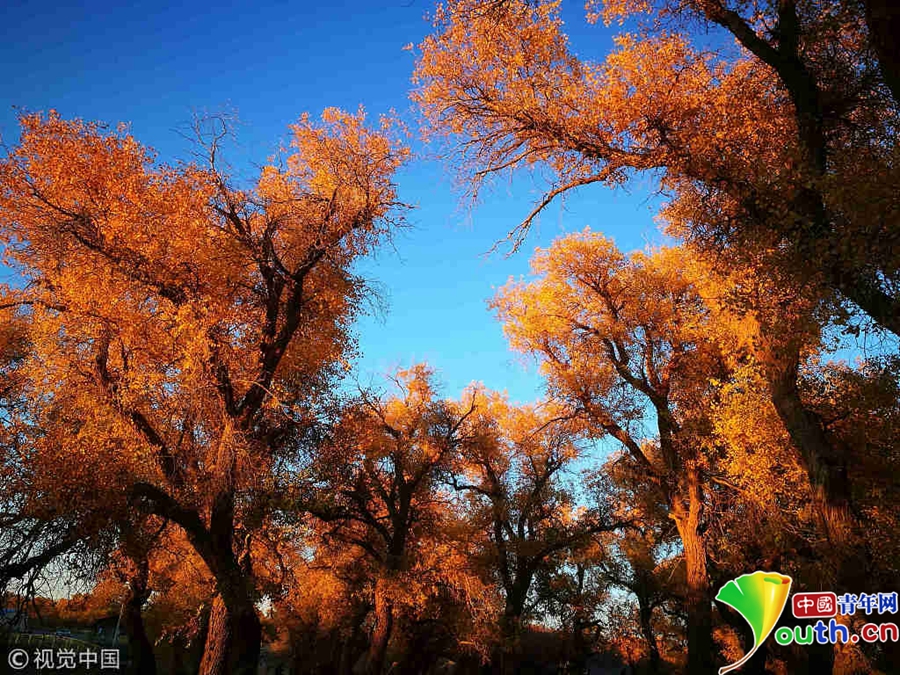 大片的胡楊樹葉由綠變黃,一眼望去,陽光下金色的樹葉襯著湛藍的天空于風中婆娑起舞。