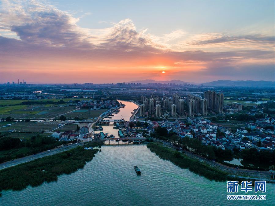 這是2018年9月27日航拍的夕陽(yáng)下的新塘村。浙江省長(zhǎng)興縣新塘村毗鄰太湖,該村以蔬菜種植、水產(chǎn)捕撈為主導(dǎo)產(chǎn)業(yè),素有“浙北水產(chǎn)第一村”之稱。新華社記者 徐昱 攝