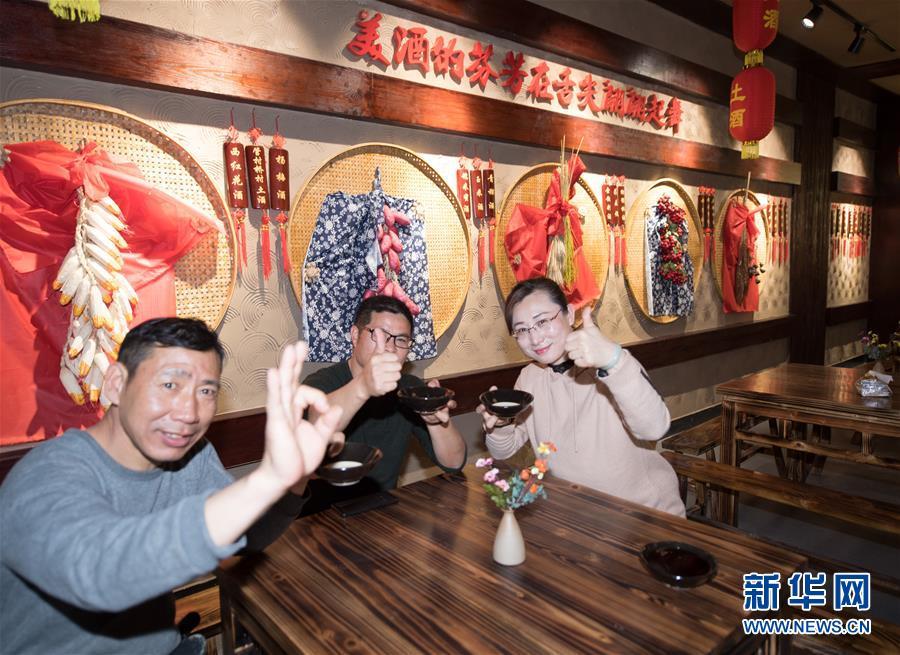 游客在浙江省建德市大同鎮(zhèn)管村橋村文化禮堂品嘗該村特產(chǎn)土酒(2018年3月13日)。2017年起,建德市對(duì)農(nóng)村文化禮堂建設(shè)進(jìn)行“一村一品”提升改造,打造惠民、育德、展示等為一體的文化禮堂,嘗試“鄉(xiāng)村文創(chuàng)客廳”建設(shè),促進(jìn)鄉(xiāng)村振興。新華社記者 翁忻旸 攝