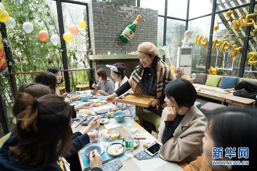 在浙江省杭州市外桐塢村,民宿主人龐代君(右三)在她創(chuàng)立于2016年的“畫·鄉(xiāng)院”精品民宿為客人送早餐(2018年1月3日攝)。外桐塢村是西湖西面群山中的一個(gè)小村落,傳統(tǒng)以茶葉生產(chǎn)為主要經(jīng)濟(jì)來(lái)源,自2010年以來(lái)著力打造藝術(shù)村落,目前已擁有藝術(shù)家工作室43個(gè)、高檔民宿7家、美術(shù)館和展廳3家。新華社記者 翁忻旸 攝