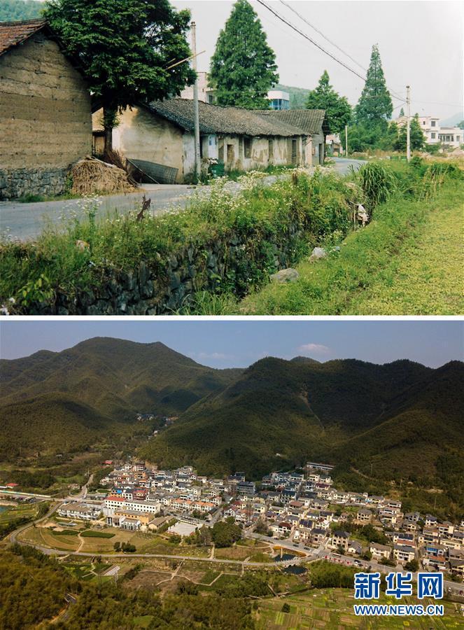 拼版照片:上圖為浙江省湖州市安吉縣天荒坪鎮(zhèn)余村村1988年時(shí)的資料照片;下圖為2018年3月23日無(wú)人機(jī)拍攝的浙江省安吉縣天荒坪鎮(zhèn)余村村(新華社記者黃宗治攝)。新華社記者 黃宗治 攝