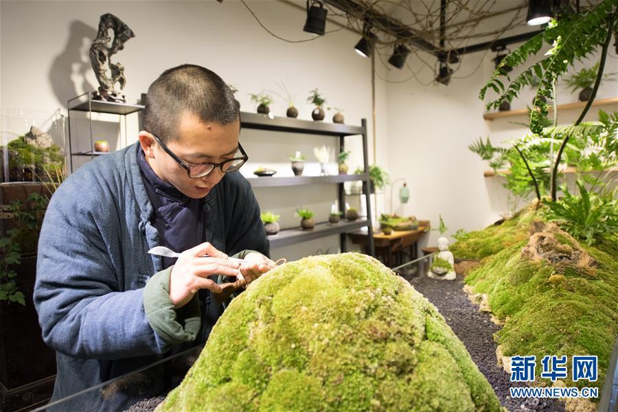 安徽籍藝術(shù)家潘銳在2012年創(chuàng)立于杭州市外桐塢村的“植覺”工作室打點(diǎn)苔蘚盆景(2018年1月14日攝)。外桐塢村是西湖西面群山中的一個(gè)小村落,傳統(tǒng)以茶葉生產(chǎn)為主要經(jīng)濟(jì)來(lái)源。自2010年以來(lái),外桐塢村著力打造藝術(shù)村落。 新華社記者 翁忻旸 攝