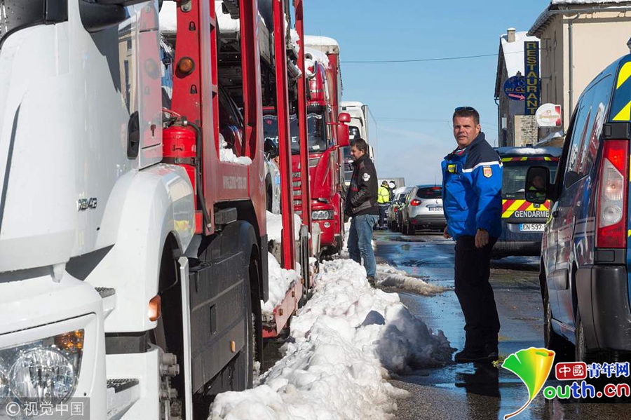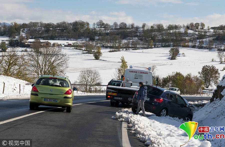當(dāng)?shù)貢r間2018年10月30日,法國菲克斯圣熱內(nèi),當(dāng)?shù)赝唤荡笱瑢?dǎo)致950人被困在大雪覆蓋的公路上,不得不睡在緊急救援中心。法國國家氣象局已經(jīng)將當(dāng)?shù)刂糜诔壬踩渲隆?/p>