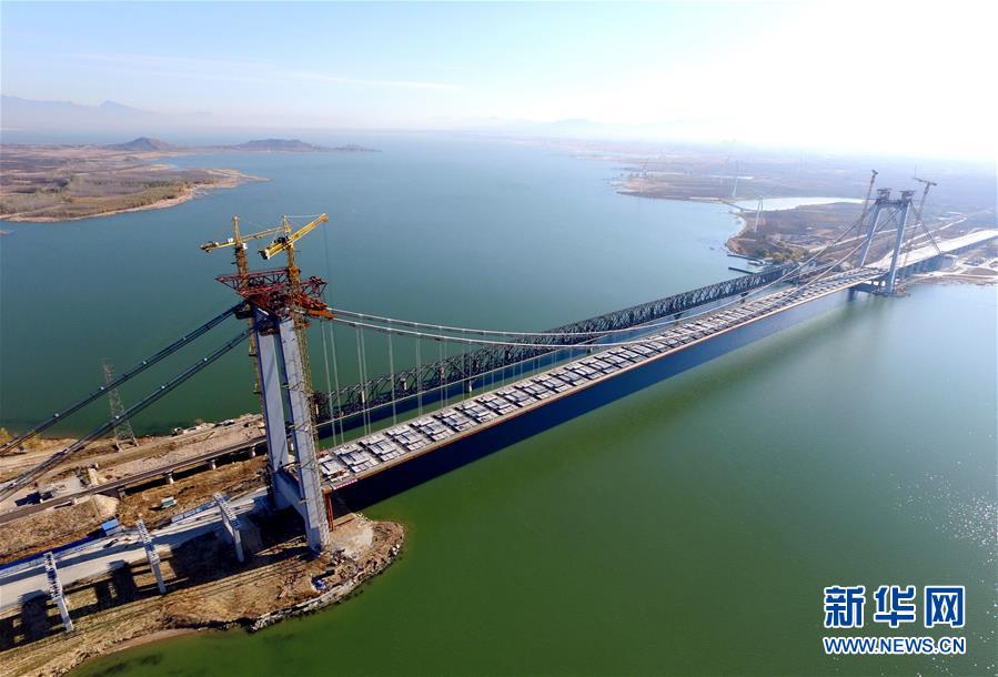當(dāng)日,河北省懷來(lái)縣官?gòu)d水庫(kù)公路大橋主橋成功合龍。據(jù)介紹,該橋采用雙向四車(chē)道城市主干路標(biāo)準(zhǔn)建設(shè),設(shè)計(jì)為雙塔單跨懸索橋,全長(zhǎng)1988米, 橋主塔高107.8米,橋?qū)?3.6米,主橋720米一跨過(guò)湖。