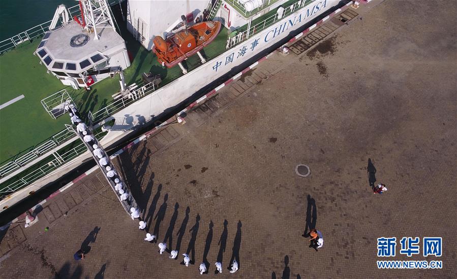 11月3日,海事執(zhí)法人員登上“海巡21”輪(無人機拍攝)。當日,隨著“海巡21”輪緩緩駛離??诤J卤O(jiān)管基地碼頭,由瓊桂粵海事部門共同開展的瓊州海峽、北部灣及環(huán)海南島水域跨轄區(qū)聯(lián)合巡航執(zhí)法活動揭開序幕。新華社記者楊冠宇攝