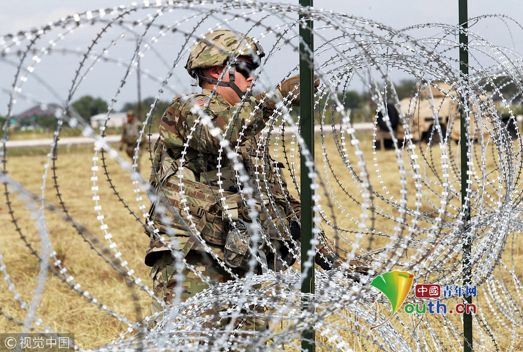 美國士兵部署美墨邊境點,鋪設(shè)鐵絲網(wǎng)應(yīng)對移民大軍壓境。