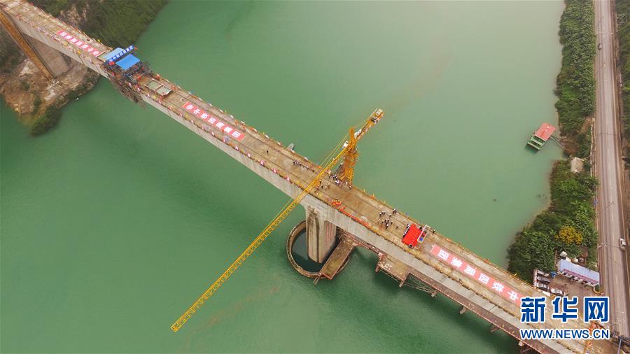 在重慶涪陵拍攝的渝懷鐵路涪秀二線(xiàn)重點(diǎn)工程——烏江右線(xiàn)大橋(10月23日無(wú)人機(jī)拍攝)。 10月23日,由中鐵四局承建的渝懷鐵路涪秀二線(xiàn)重點(diǎn)工程——烏江右線(xiàn)大橋主跨成功合龍,標(biāo)志著大橋主體工程全部順利結(jié)束。烏江右線(xiàn)大橋項(xiàng)目全程460.1米,主跨192米,跨越烏江和319國(guó)道。在兩年多的建設(shè)過(guò)程中,施工人員攻克了“不等高墩”“不對(duì)稱(chēng)邊跨”“邊跨入隧”等多個(gè)技術(shù)難題。 新華社記者王全超攝