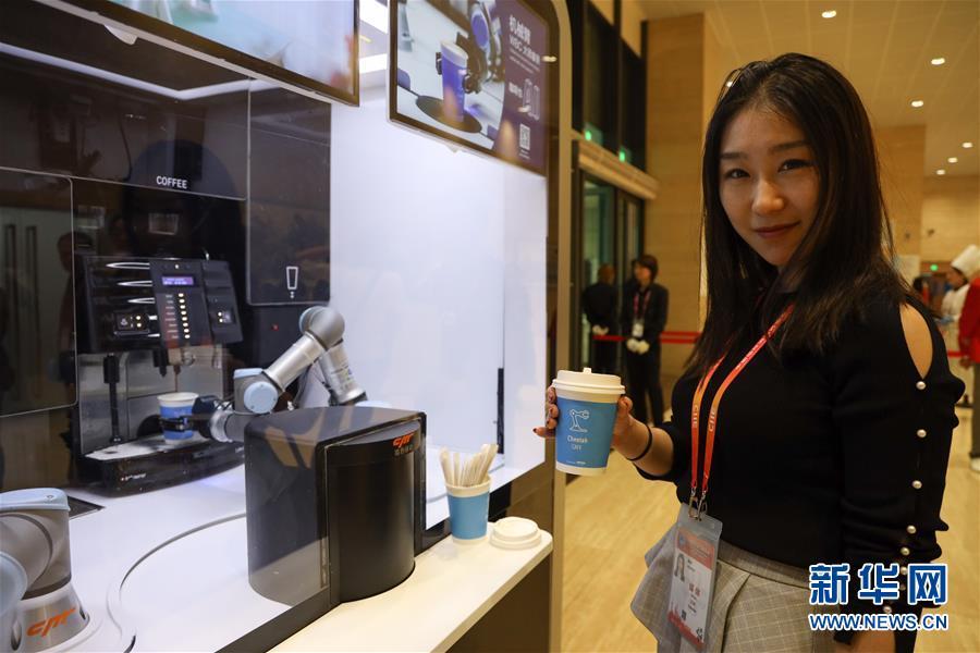 11月4日,一位媒體記者在首屆中國(guó)國(guó)際進(jìn)口博覽會(huì)新聞中心無(wú)人咖啡亭品嘗咖啡。 新華社記者 劉大偉 攝