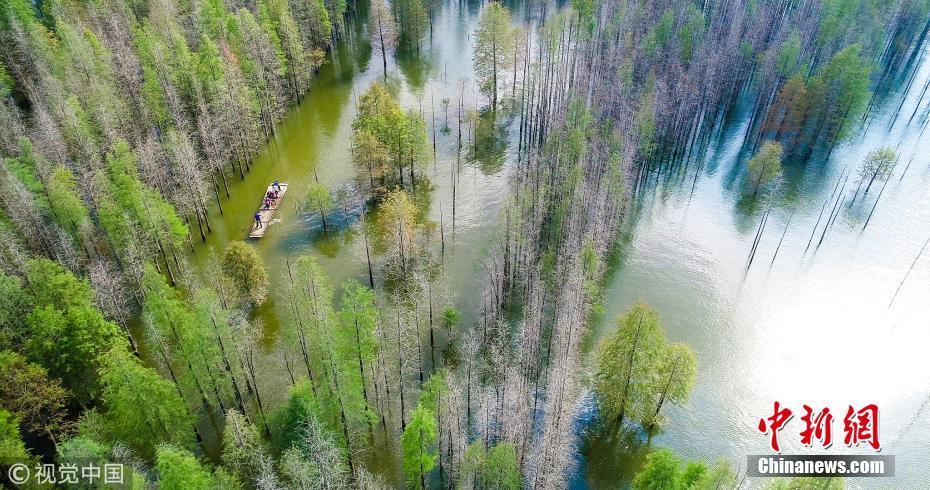 10月5日,航拍安徽宣城寧國(guó)方塘鄉(xiāng)汪村青龍湖港口灣水庫(kù),游客們泛舟湖上,穿梭于紅杉林中,享受秋日的美好時(shí)光。 圖片來(lái)源:視覺(jué)中國(guó)