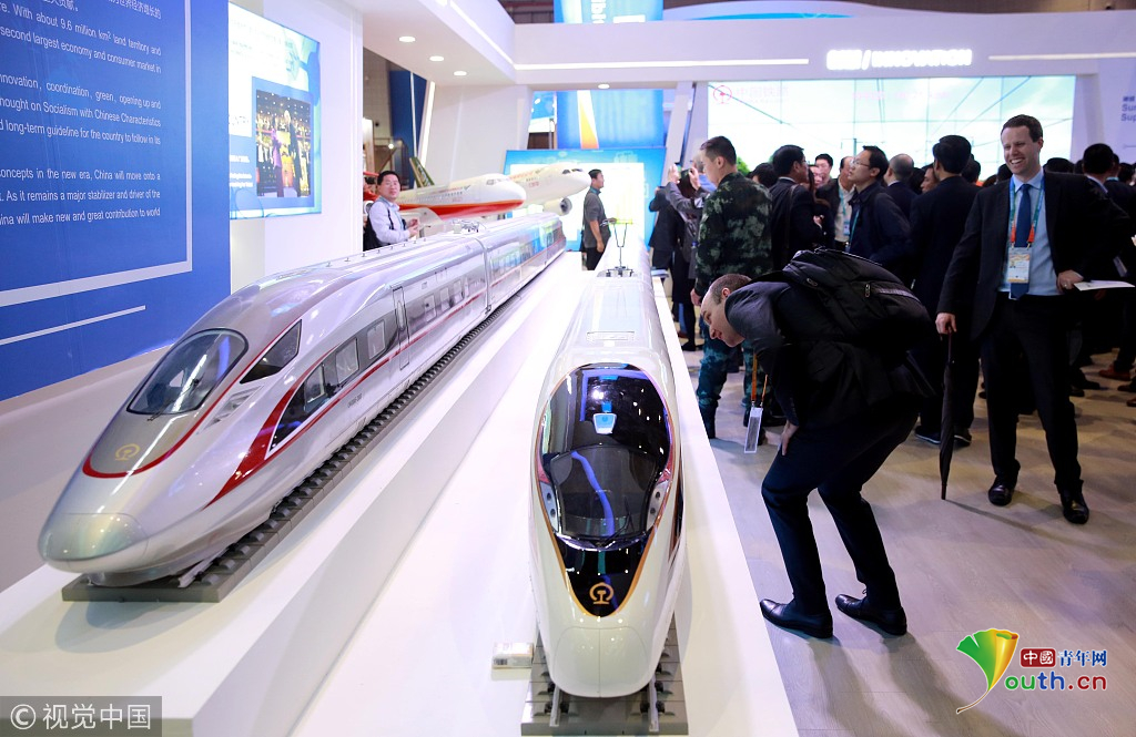 2018年11月6日,上海,首屆中國國際進口博覽會國家展上,共有82個國家、3個國際組織設(shè)立了71個展臺。中國館展示的復(fù)興號。視覺中國