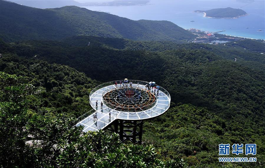 8月31日,游客在玻璃觀景平臺上參觀游覽。近日,位于海南省三亞市亞龍灣熱帶天堂森林公園的大佛石全海景玻璃棧道開始正式營業(yè)。凌空而建的玻璃棧道全長400米,游客可將亞龍灣的美景盡收眼底。新華社記者郭程攝