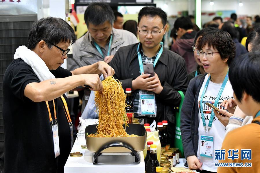 11月7日,來自新加坡廣祥泰私人有限公司的工作人員用公司生產的調料為觀眾現(xiàn)場烹制炒面。 新華社記者 李鑫 攝