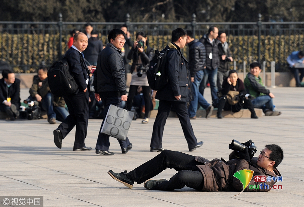 2013年3月5日,北京,一名攝影記者躺在地上仰拍人民大會(huì)堂外景。 圖片作者:有待/視覺中國(guó)