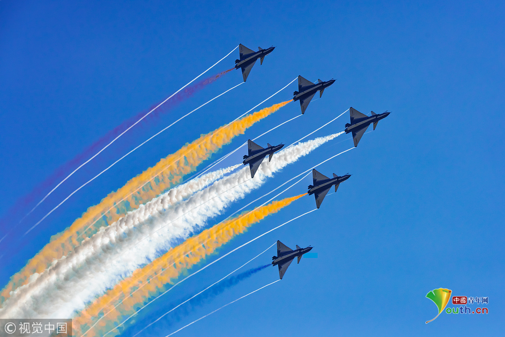 2018年11月6日,第十二屆中國國際航空航天博覽會在珠海拉開帷幕。八一飛行表演隊的殲-10率先上陣,為觀眾獻(xiàn)上精彩的飛行表演。視覺中國