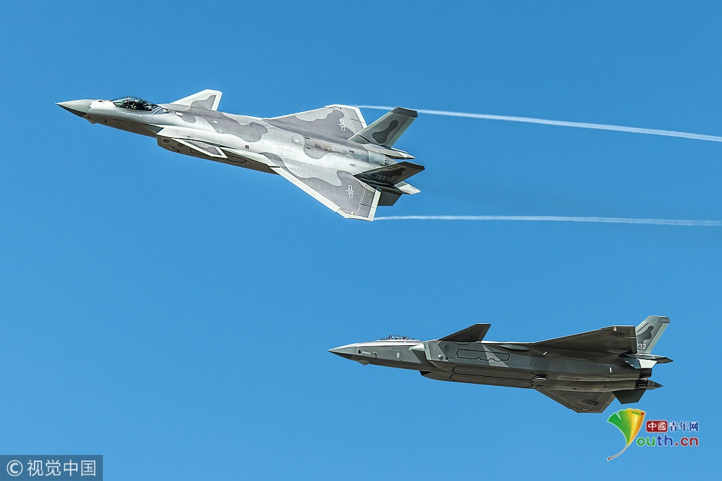 圖二:2018年11月6日,廣東珠海航展上,兩架殲-20戰(zhàn)機組成雙機編隊進行飛行表演。