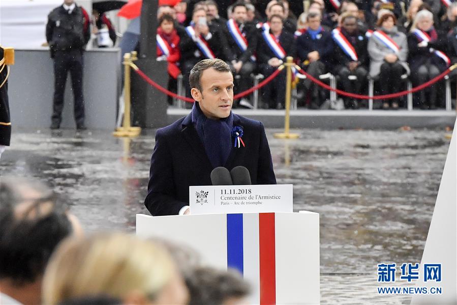 11月11日,在法國巴黎,法國總統(tǒng)馬克龍?jiān)诩o(jì)念儀式上致辭。當(dāng)日,法國政府在巴黎凱旋門前舉行儀式,隆重紀(jì)念第一次世界大戰(zhàn)結(jié)束一百周年。新華社記者 陳益宸 攝