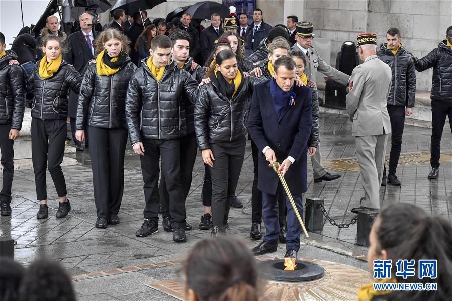 11月11日,在法國巴黎,法國總統(tǒng)馬克龍?jiān)诩o(jì)念儀式上撥旺無名烈士墓的火焰。當(dāng)日,法國政府在巴黎凱旋門前舉行儀式,隆重紀(jì)念第一次世界大戰(zhàn)結(jié)束一百周年。新華社記者 陳益宸 攝
