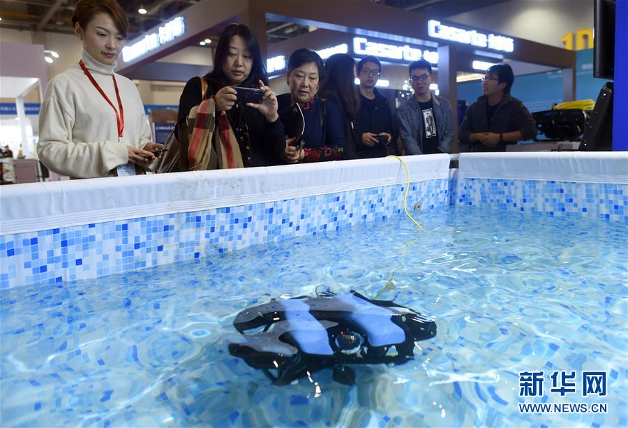 11月10日,人們在展會(huì)現(xiàn)場觀看展出的一款小型水下機(jī)器人。 新華社記者韓傳號攝
