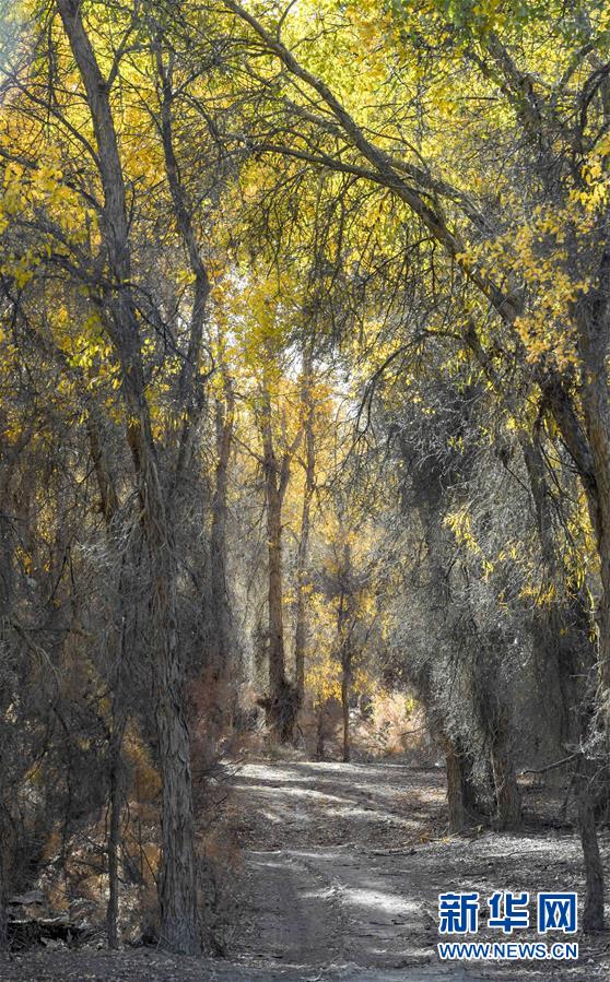 新疆尉犁縣胡楊林深處的一條小路(10月25日攝)。 10月中下旬,靜靜的塔里木河中下游一片金黃。胡楊深處,條條小路蜿蜒綿長通向遠方,引人入勝。 塔里木河是中國最長的內(nèi)陸河,這一區(qū)域原始胡楊林分布較為集中。隨著塔里木河連續(xù)19次向下游生態(tài)輸水,為胡楊林“解渴”,塔河兩岸生態(tài)得到明顯改善,沙地面積逐年減少。 新華社記者趙戈攝