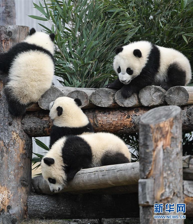 這是在中國大熊貓保護(hù)研究中心臥龍神樹坪基地拍攝的三只大熊貓(2018年4月25日攝)。 新華社記者 薛玉斌 攝