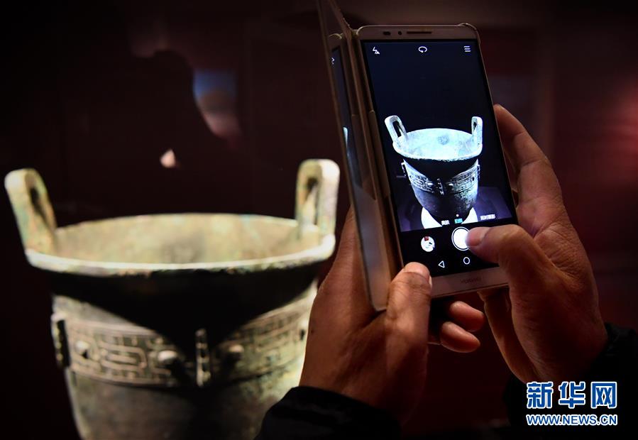 10月12日,參觀者在安陽博物館拍攝展品。目前,“鳳歸大邑商——殷墟婦好文物安陽故里展”正在安陽博物館展出,共展出文物474件。1976年被考古學家發(fā)現(xiàn)的婦好墓,是世界文化遺產、中國商代后期都城遺址——殷墟唯一保存完整的商代王室墓葬。新華社記者李安攝
