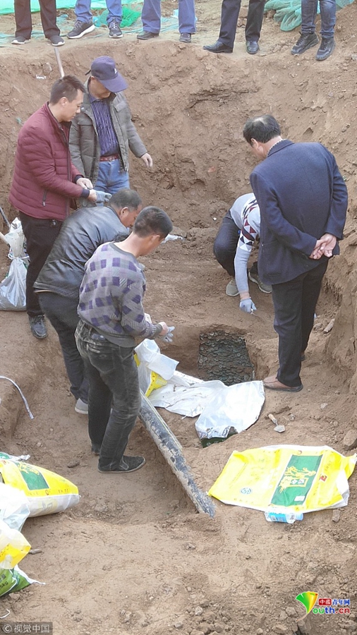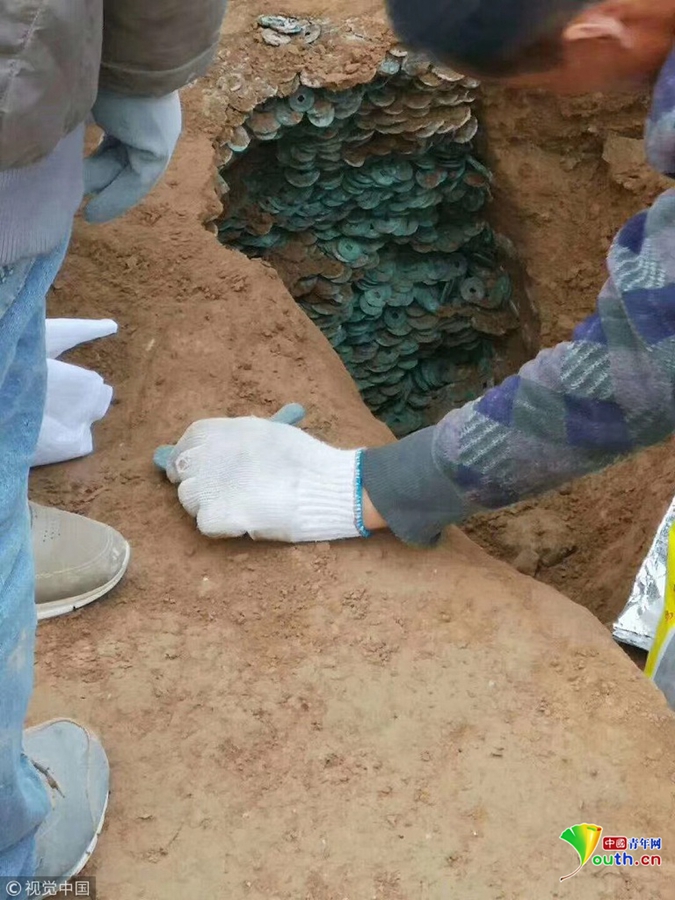 2018年11月9日,陜西渭南,白水一工地發(fā)現(xiàn)大量古幣,共清理發(fā)掘古幣920斤、約10萬枚。經初步鑒定,這些古幣多為北宋時期錢幣,初步判斷為一般文物,對研究當?shù)亟洕扔幸欢▋r值。圖片:視覺中國。文字:華商報