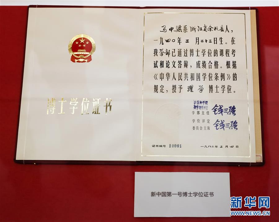 這是在“歷史巨變”展區(qū)拍攝的新中國(guó)第一號(hào)博士學(xué)位證書(11月15日攝)。