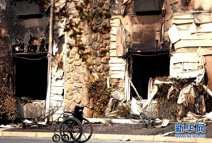 11月18日,在美國加利福尼亞州比尤特縣天堂鎮(zhèn),一個輪椅被棄置在一幢遭焚毀的住所旁。 新華社記者吳曉凌攝