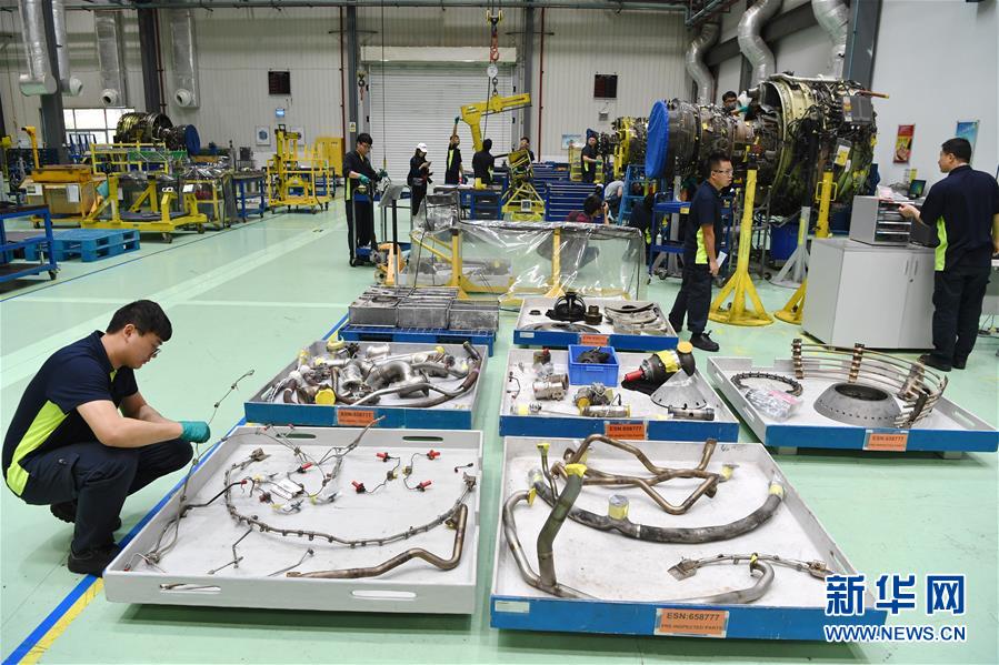 11月15日,在福建自貿(mào)區(qū)廈門片區(qū)的新科宇航科技有限公司航空維修車間內(nèi),技術(shù)人員在拆解飛機(jī)發(fā)動機(jī)。新華社記者姜克紅攝
