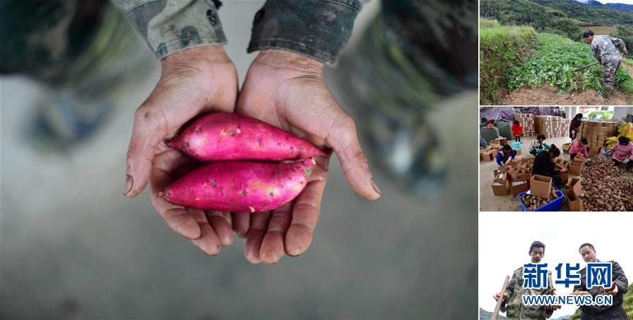 拼版照片:左圖為在大浪鎮(zhèn)桐里村,55歲的韋炳莊手捧剛剛收獲的高山紅薯;右上圖為韋炳莊在地里挖紅薯;右中圖為在縣城一個電商基地里,工作人員打包貧困戶種植的紅薯,準(zhǔn)備發(fā)往全國各地;右下圖為韋炳莊(左)在地里挖紅薯(照片均攝于11月18日)。今年,韋炳莊種植3畝高山紅薯,每畝年產(chǎn)3000多斤,他家已于2016年實現(xiàn)脫貧。 廣西融水苗族自治縣是國家扶貧工作重點縣,全縣“九山半水半分田”,生活生產(chǎn)環(huán)境較為惡劣,脫貧攻堅任務(wù)艱巨,目前還有7.68萬貧困人口。面對經(jīng)濟發(fā)展落后、貧困面廣且程度深的現(xiàn)狀,當(dāng)?shù)匕衙撠毠耘c創(chuàng)新產(chǎn)業(yè)扶持相結(jié)合,依托生態(tài)資源優(yōu)勢,實施“特色產(chǎn)業(yè)富民行動”,通過發(fā)展特色民族旅游、林下經(jīng)濟和特色養(yǎng)殖業(yè)等扶貧產(chǎn)業(yè),帶動貧困群眾依靠勤勞的雙手,拔窮根摘窮帽,實現(xiàn)脫貧致富。據(jù)了解,目前全縣貧困戶參與特色產(chǎn)業(yè)發(fā)展的有2.9萬戶,扶貧產(chǎn)業(yè)覆蓋率達95%。 新華社記者 黃孝邦 攝