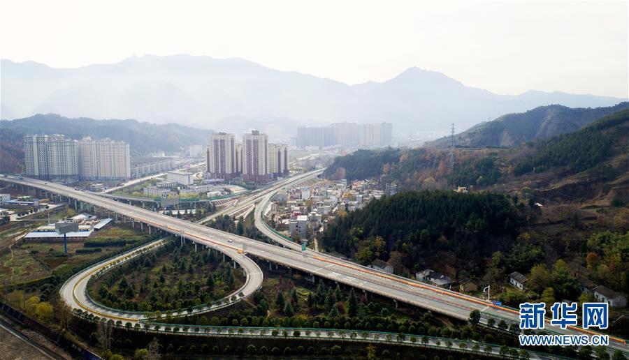 11月20日拍攝的水陽高速公路與福銀高速公路相接的樞紐互通式立交(無人機(jī)拍攝)。 近日,記者從陜西省交通建設(shè)集團(tuán)公司了解到,陜西柞水至山陽高速公路已全線貫通即將通車。據(jù)介紹,(柞)水(山)陽高速公路全長78.8公里,開通后將實(shí)現(xiàn)包茂高速、福銀高速在陜南商洛地區(qū)的連接,開辟出秦嶺南麓的一條橫向高速大通道,對(duì)完善陜西高速公路路網(wǎng)結(jié)構(gòu)、促進(jìn)陜南區(qū)域經(jīng)濟(jì)發(fā)展、加快山區(qū)群眾脫貧致富具有重要意義。 新華社記者劉瀟攝