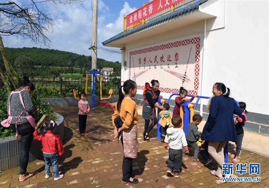 10月6日,在尋甸回族彝族自治縣塘子街道小海村,家長帶著孩子在村里的休閑健身廣場(chǎng)玩耍。國慶節(jié)期間,云南省尋甸回族彝族自治縣塘子街道小海村一片喜慶祥和。人們身著節(jié)日盛裝,載歌載舞,歡慶搬入新居后的第一個(gè)國慶節(jié)。新華社記者楊宗友攝