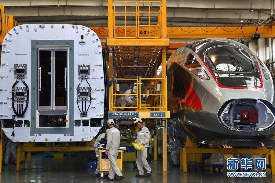 2018年5月10日,“復(fù)興號(hào)”動(dòng)車組在總裝生產(chǎn)線上裝配。新華社記者 李紫恒 攝