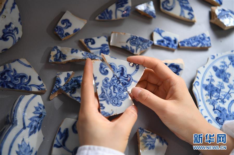 在江西景德鎮(zhèn)御窯廠(chǎng)遺址,工作人員正在修復(fù)明代瓷枕(10月18日攝)。 新華社記者 萬(wàn)象 攝
