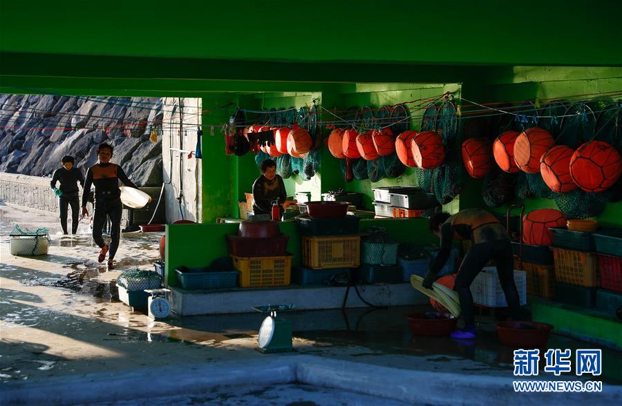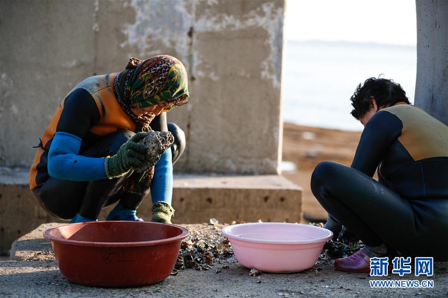 11月23日,海女們在韓國濟州島的一處海岸附近處理打撈出的海產(chǎn)品。新華社記者王婧嬙攝