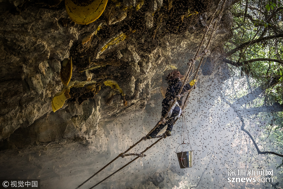 2018年5月10日,云南普洱。 “最難采摘的崖蜜,是凹進懸崖內(nèi)側(cè)3至5米的那種?!眱赡陙恚∪镉H自跟采了十幾趟蜜,最怕遇到凹陷的蜜源。
